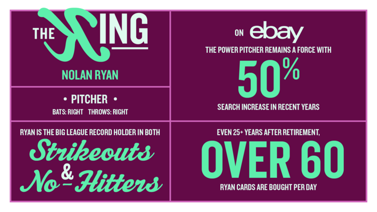The legendary power pitcher remains a powerful force on eBay 25 years after his retirement, where searches for Ryan’s cards have seen a nearly 50% increase in recent years. Fans have bought 60 Nolan Ryan cards per day.