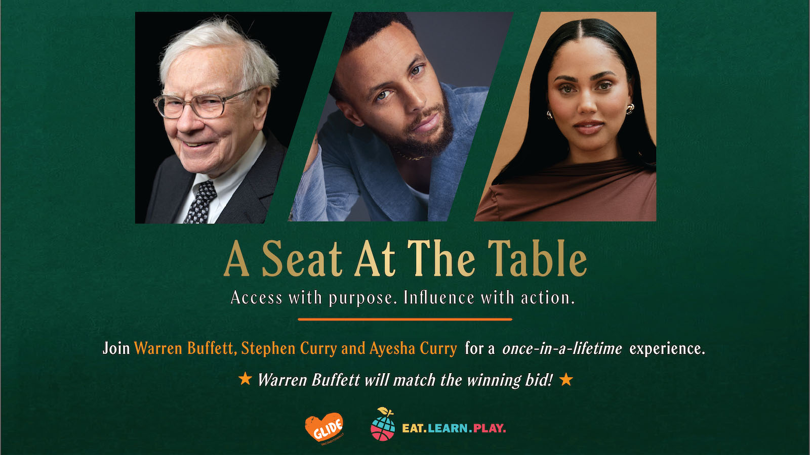 A Seat at the Table brings together American business icon Warren Buffett, 4x NBA champion and 2x MVP basketball Stephen Curry, and restaurateur, chef, 2x New York Times bestselling author, and actress Ayesha Curry. The winner and seven guests will come together with these legends for a private lunch experience in Omaha, Nebraska, while supporting programs from the GLIDE Foundation and Eat.Learn.Play Foundation.