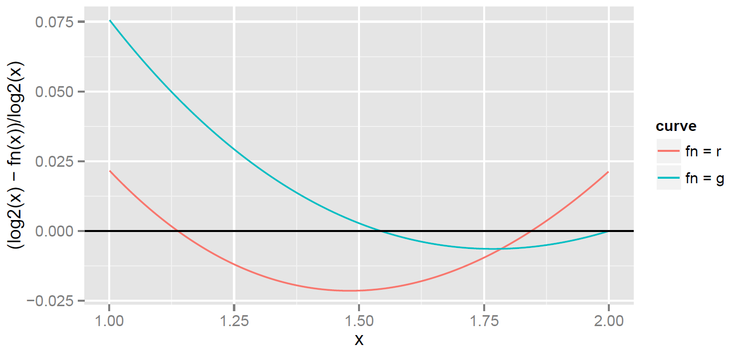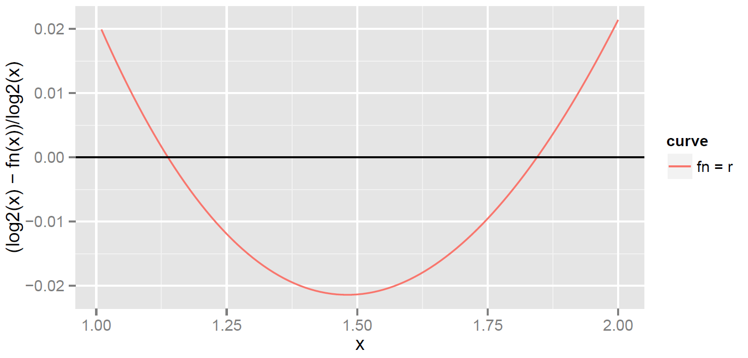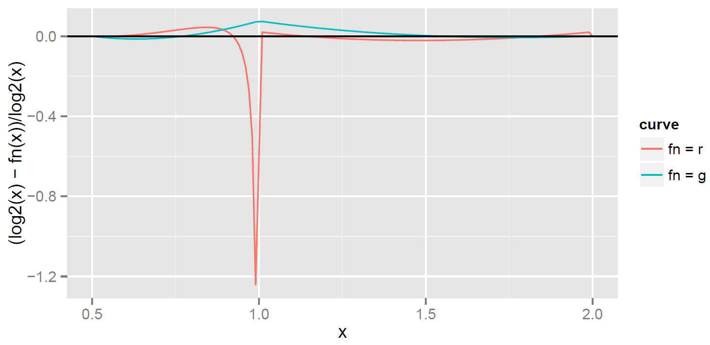 You can find code for approximate logs on the web, but they rarely come with an evaluation of how they compare to the alternatives, or in what sense they might be optimal. That is the gap I’m trying to fill here. The first post in this series covers the basics, but even if you are familiar with this subject I think you will find some interesting nuggets. The second post considers rounding error, and the final post gives the code for a family of fast log functions.