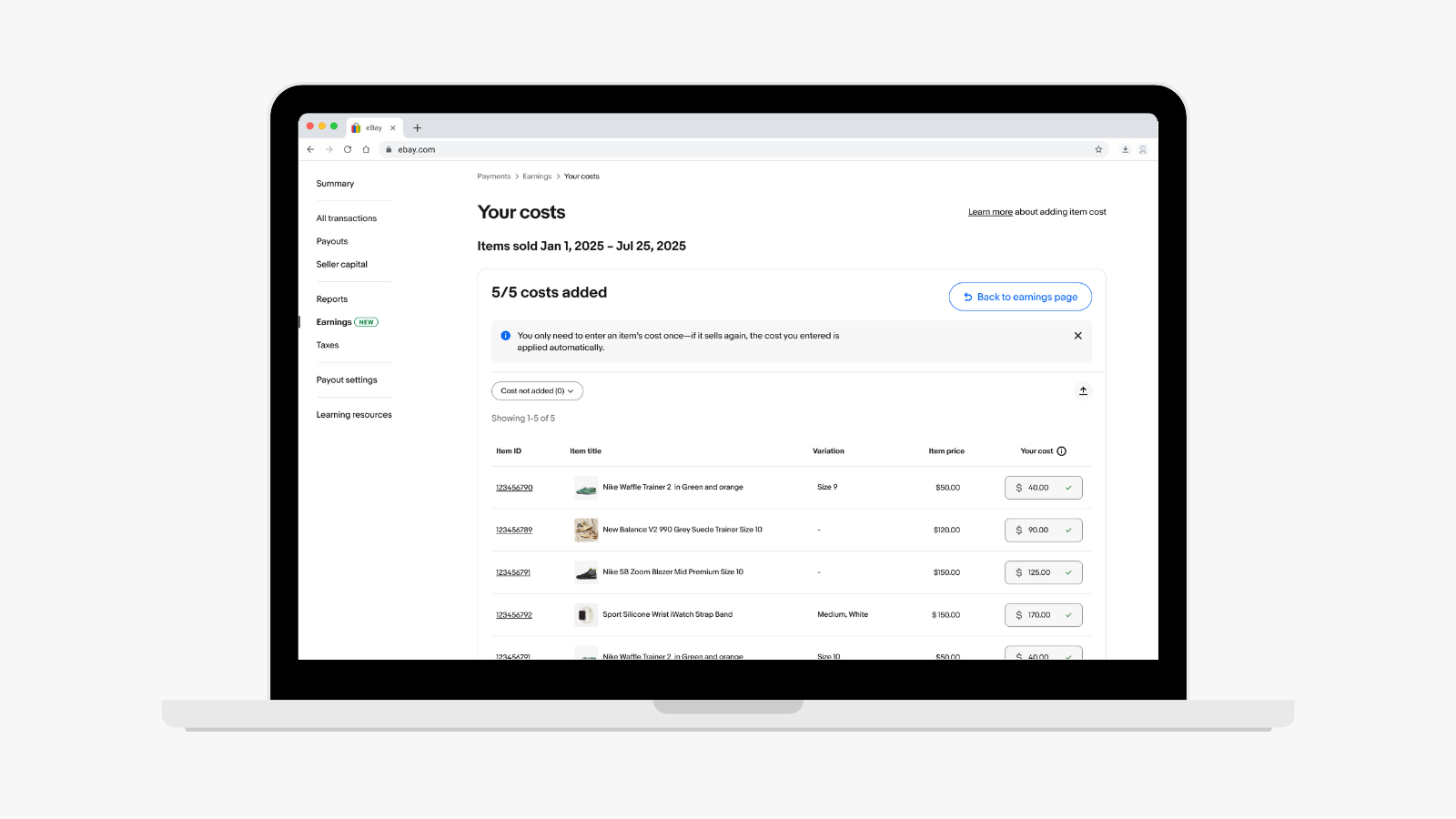 Sellers who buy inventory with resale in mind know that tracking item-level costs is crucial for profitability, which is why eBay is introducing an optional “Your cost” field in the listing flow to input, update, and manage their costs with ease. Once an item has resulted in a sale, sellers can also input and update their cost from the earnings page. This results in smarter pricing decisions without needing a separate spreadsheet or tool. Sellers can update the cost data at any time and use it to plan promotions, adjust ad rates, and more confidently price their inventory. It will also feed into their earnings page, which is located under the Seller Hub Payments tab.