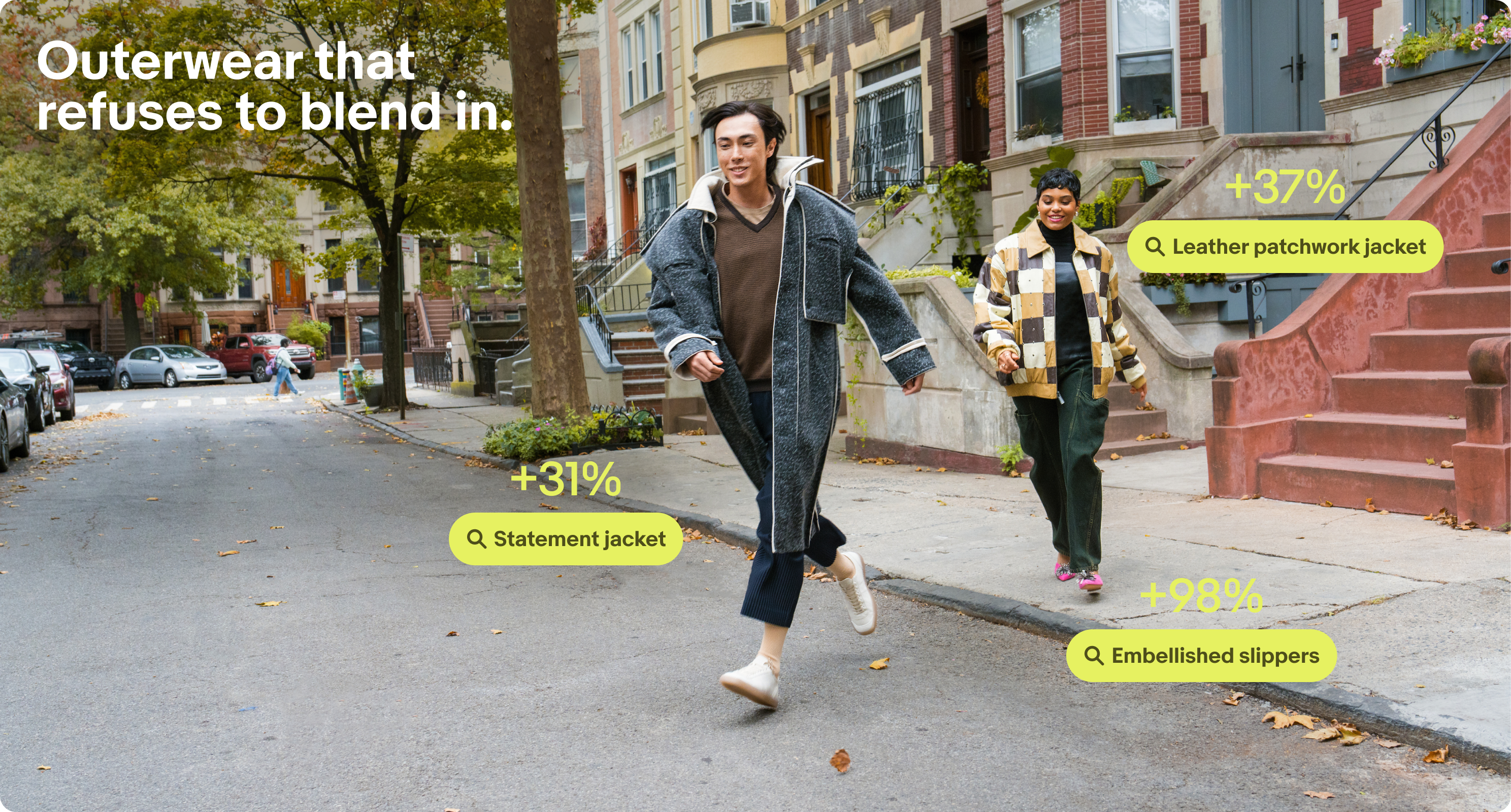 Outerwear turned into the ultimate statement piece, with bright coats (+365% year-over-year) and funnel-neck jackets (+136%) leading the charge.