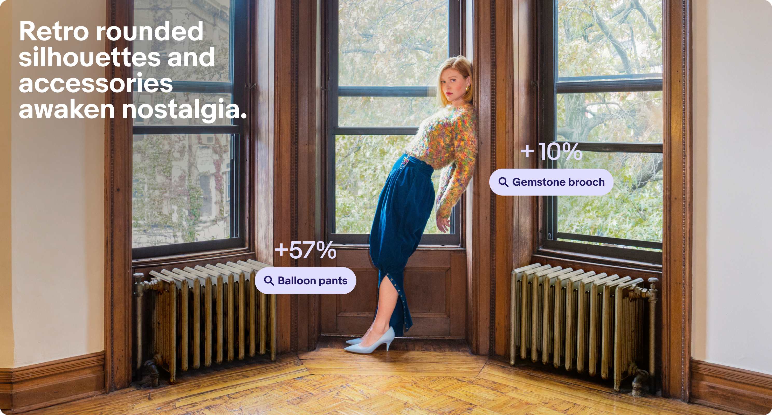 Retro silhouettes are back — tea-length skirts (+90% year-over-year) and balloon sleeves (+20%) showcase fashion’s fondness for timeless drama.