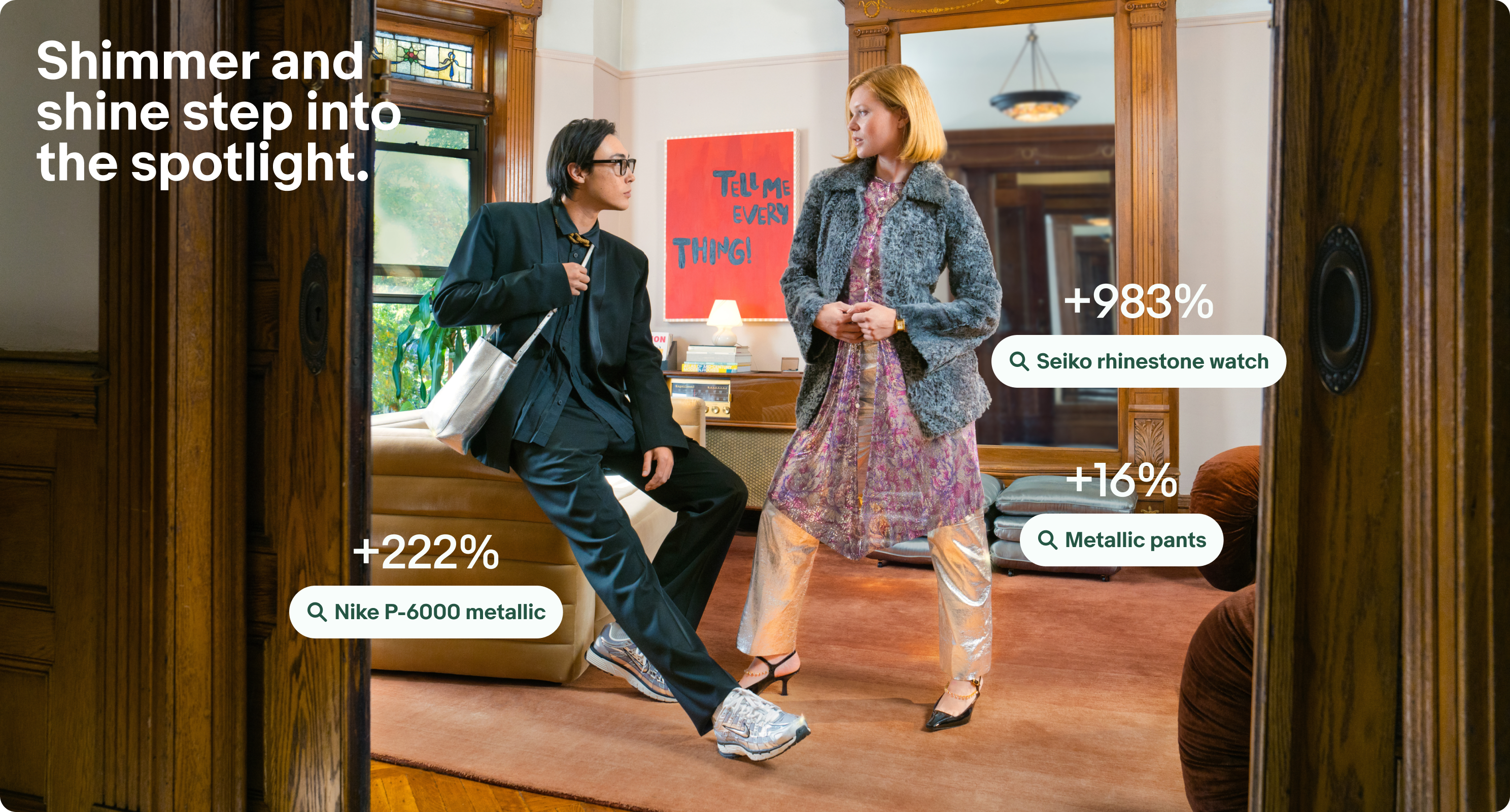 Rhinestones, metallics, and shimmer are stealing the spotlight. Searches for metallic Onitsuka Tigers rose 423% year-over-year, while Seiko rhinestone watches saw an incredible 983% search jump.