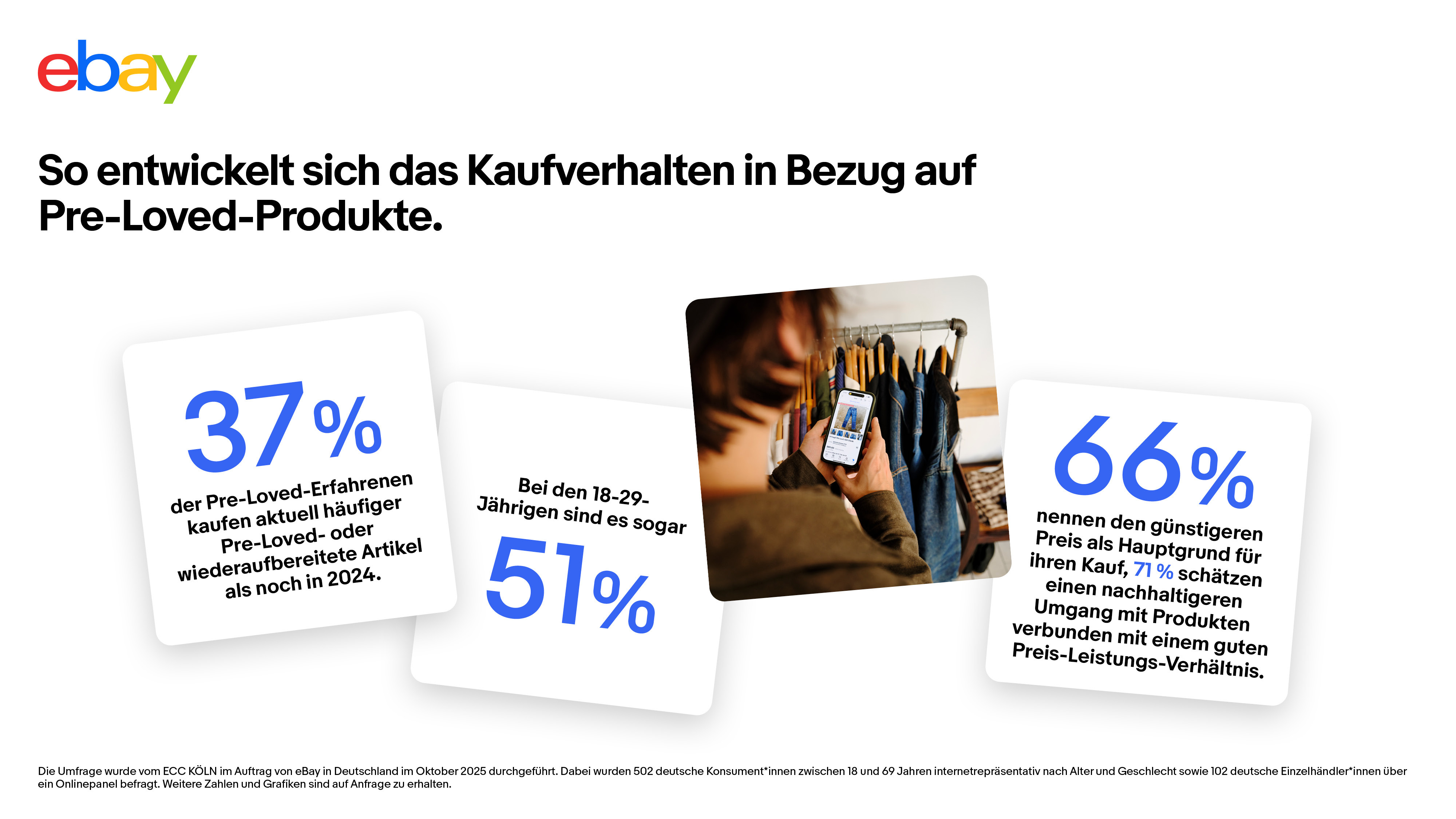 *Die Umfrage wurde vom ECC KÖLN im Auftrag von eBay in Deutschland im Oktober 2025 durchgeführt. Dabei wurden 502 deutsche Konsument*innen zwischen 18 und 69 Jahren internetrepräsentativ nach Alter und Geschlecht sowie 102 deutsche Einzelhändler*innen über ein Onlinepanel befragt. Weitere Zahlen und Grafiken sind auf Anfrage zu erhalten.