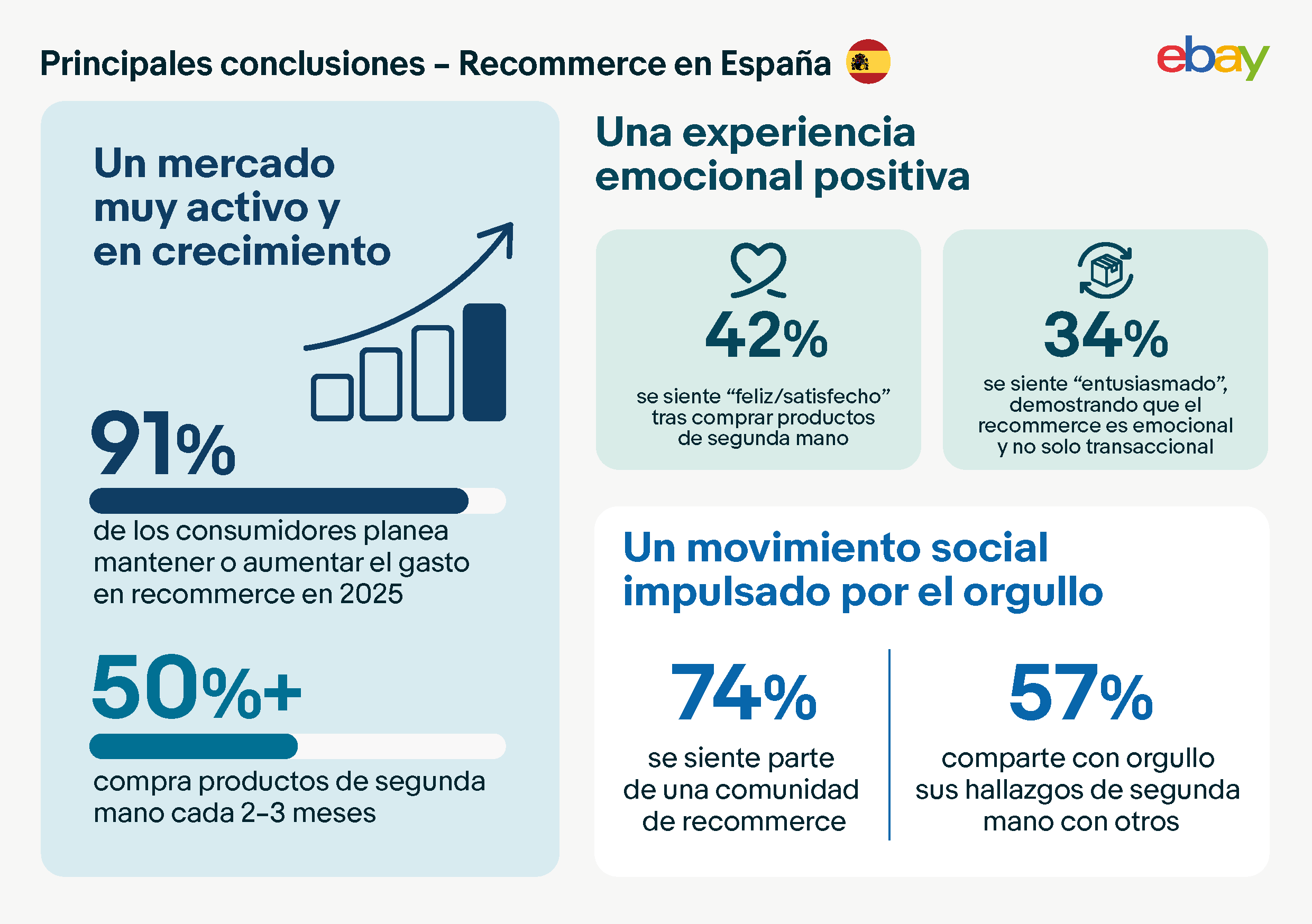 Madrid, Noviembre 18, 2025 — eBay Inc. (Nasdaq: EBAY), líder global en comercio electrónico que conecta a millones de compradores y vendedores en todo el mundo, ha publicado hoy su quinto Informe Anual de Recommerce, que revela el fuerte impulso de la economía de segunda mano en España, donde la compra de productos de segunda mano se ha convertido ya en un hábito generalizado.
